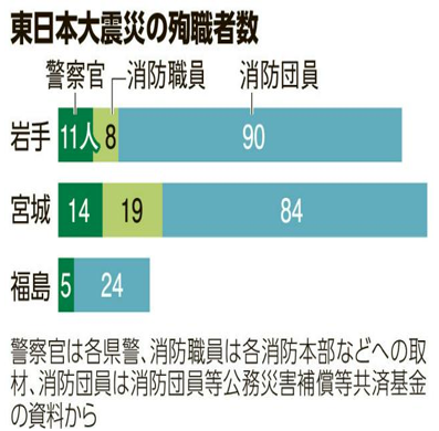 津波での自己犠牲的な死者ということになりますと、3月9日の朝日新聞の記事。「東日本大震災では、人を助けようとして、大勢の人が命を落とした。地震の後、迫り来る津波の被害を防ごうと海岸近くにとどまり、住民の避難誘導や救助、水門閉鎖などの任務に当たった人たちだ。」