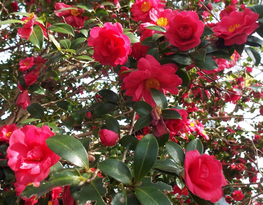 毎年、お正月に樹一杯、枝一杯にすばらしく豊かに花をつける山茶花ですが、夏にチャドウクガにやられて葉っぱが全滅してました。枯れるのか! とかなり悲痛な思いでいましたら、ポツポツと葉が芽吹き始め、気がつくと生えそろっていました。ただそうなると開花は遅れるものなのでしょう、やっと今、2月に入って満開です。贔屓目に見るせいか、苦難を乗り超えただけに、ひときわ華やいで咲いているように映ります。